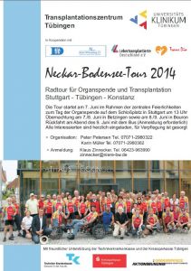 Die Neckar-Bodensee-Tour ist eine Radtour transplantierter Patienten, an der mehrheitlich Betroffene, aber auch Angehörige, Ärzte und Pflegepersonal, Transplantationsbeauftragte und Intensivmediziner teilnehmen. Jeder der die Organspende unterstützen möchte, kann dabei sein. Inspiriert von der Euregio-Tour in Österreich/Südtirol wurde sie 2007 von Prof. Alfred Königsrainer und Dr. Peter Petersen zusammen mit Klaus Zinnecker ins Leben gerufen und als gemeinsame Veranstaltung der Chirurgischen Universitätsklinik mit der Sportvereinigung Transplantierter und Dialysepatienten TransDia e.V. durchgeführt. Bald folgte eine eigene Radtour für Organspende von TransDia, die in anderen Regionen Werbung machte, so daß heute radelnde Transplantierte an vielen Orten demonstrieren, daß Transplantationen nicht nur Leben retten, sondern darüber hinaus sportliches Engagement und eine hohe Lebensqualität ermöglichen, für die sich das Geschenk einer Organspende immer lohnt. Auf der jährlich wechselnden Strecke werden Krankenhäuser, Rathäuser, Dialysezentren und andere Einrichtungen besucht, die die Tourteilnehmer begrüßen und zusammen mit den lokalen Medien die Öffentlichkeit über ihr Anliegen informieren.