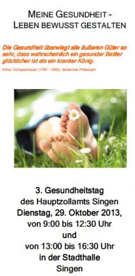 Unter dem Motto " Meine Gesundheit - Leben bewusst gestalten läd das Hauptzollamt Singen zum 3. Gesundheitstag am 29. Oktober 2013 von 9:00 bis 12:30 Uhr und von 13:00 bis 16:30 Uhrin die Stadthalle Singen ein.